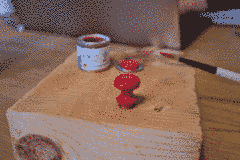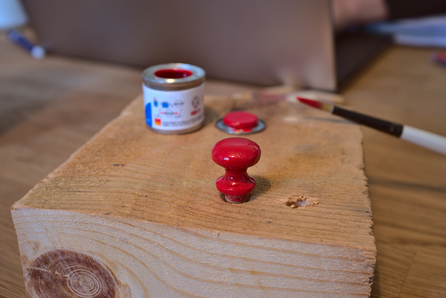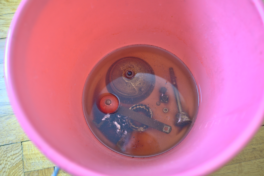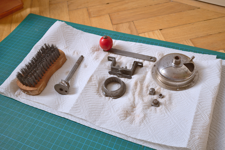 After the disassembly, the metal parts were soaked in a mixture of baking soda, vinegar and water to break down the rust. After a few hours, they were treated with a metal brush. The wooden parts were sanded and coated with olive oil. The front was re-coated with red laquer.