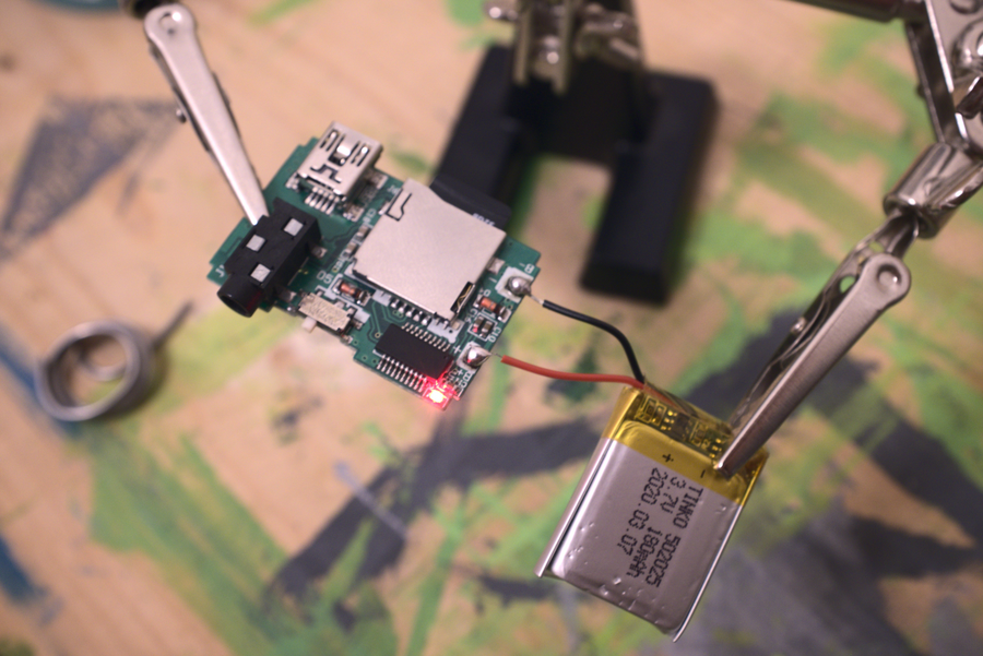 It uses a tiny 25x20x5mm 180mAh LiPo battery with 3.7 Volt that I replaced once.