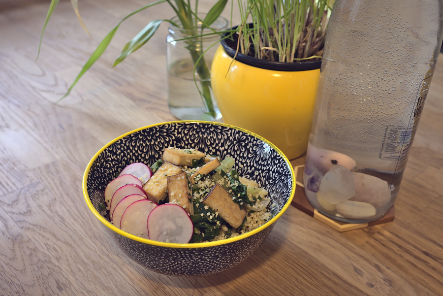 When the barley is ready, remove the lovage leaves. Put it into a bowl and mix with spinach and Tofu. Top the bowl with a sliced radish and sprinkle it with hemp seeds.