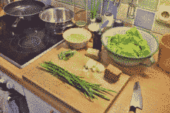 Meanwhile cut the Tofu into whatever shape you enjoy - mine were roughly 2 by 1 cm blocks. Cut the onions into larger squares and chop the garlic chive and last leaf of lovage. Chop the spinach leafs into large pieces.