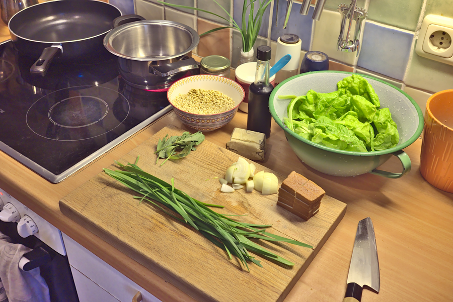 Add the lovage, garlic chive and spinach leaves. Let it cook for a minute or two while occasionally stiring. Turn off the heat and keep the pan on the stove.