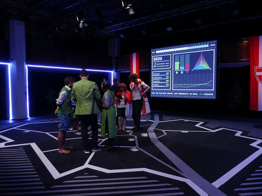 Players join one of three political parties and enter a stage onto a massive walkable map of Vienna. There, they have to utilize their parties' tablet to respond to events and make choices guiding the city into the year 2050.